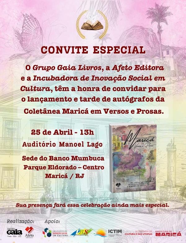 A coletânea “Maricá em Versos e Prosas”, será lançada no sábado (25), a partir das 13h, no auditório Manoel Lago, no Banco Mumbuca. O livro apresenta os contos, poemas e crônicas de 20 escritores locais, selecionados pelo júri de um concurso literário realizado pela Editora Afeto, com suporte do Grupo Gaia Livros, trazendo em suas linhas fantasias, sentimentos e reflexões dos autores sobre a vida, o passado, possível futuro, cotidiano e as paisagens da cidade.