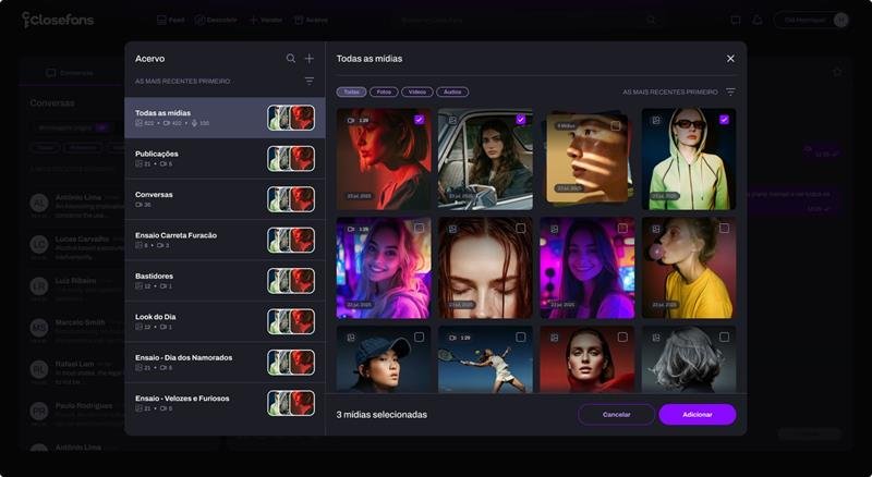 Organizar, valorizar e ter seus conteúdos sempre à mão é parte da essência do Close Fans. Com o Acervo, você não perde tempo repetindo processos, nem corre o risco de ver fotos e textos se perderem em meio a tantas conversas. Tudo está em um só lugar, estruturado e pronto para ser usado da forma mais estratégica possível.